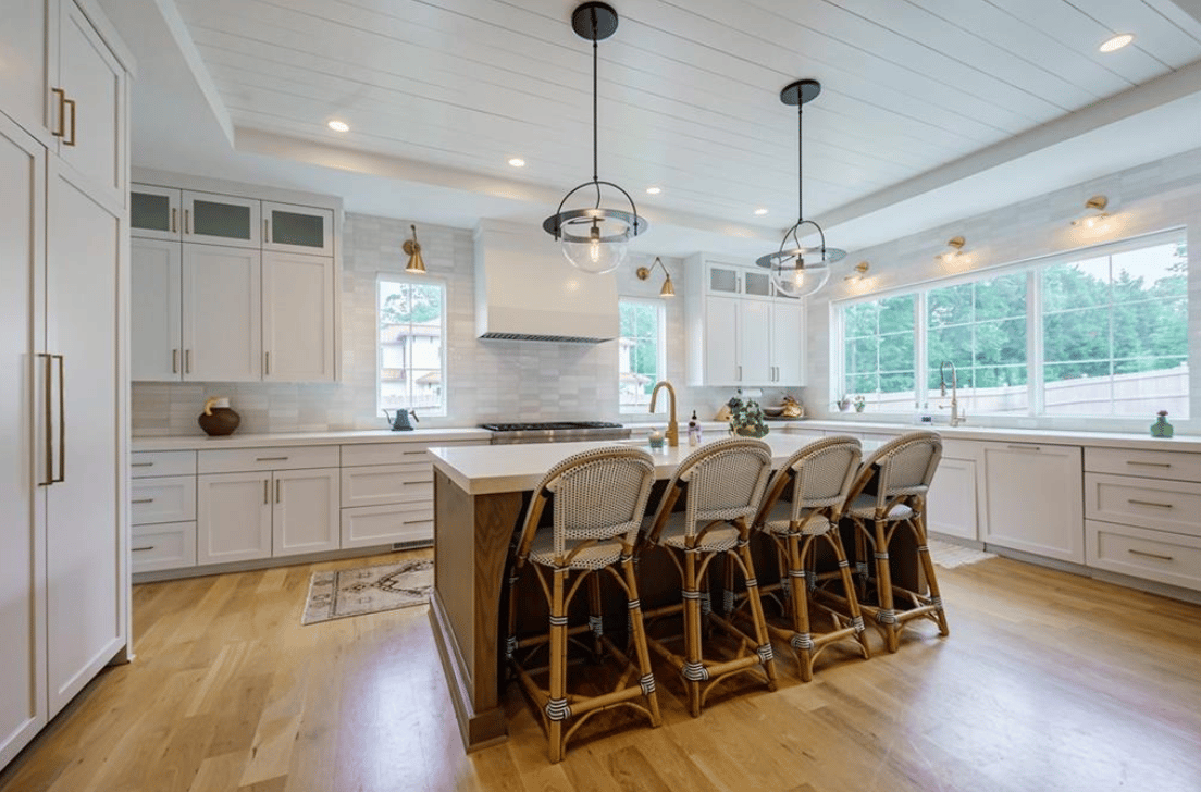 This pristine chef’s kitchen showcases a large center island sink in addition to a primary composite farm sink along a wall overlooking the back yard. Additionally, the kitchen counters are quartz with a white tiled backsplash and accompanied by custom white cabinets.