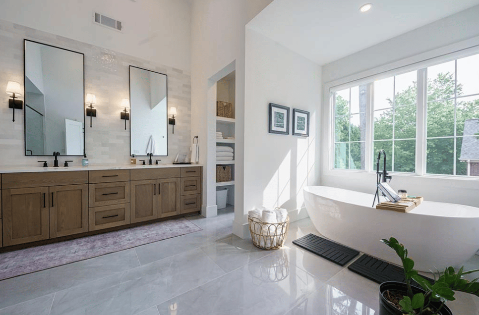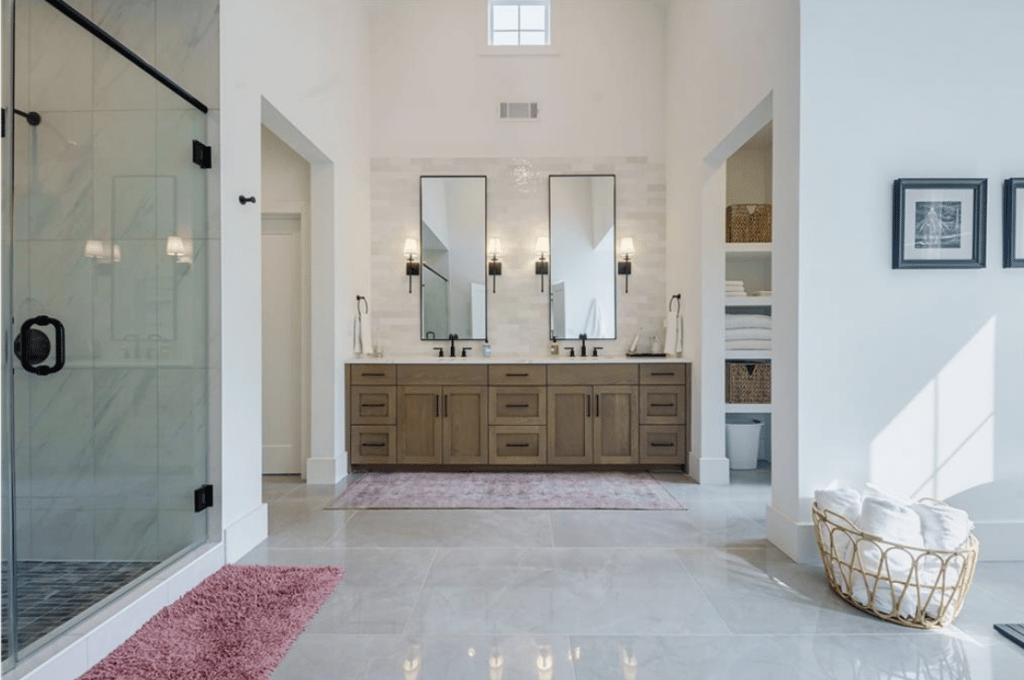 This extensive ensuite also has a separate soaking tub with a view of the backyard, dual vanities with premium matte black fixtures, and dual framed mirrors so sharing is not necessary.